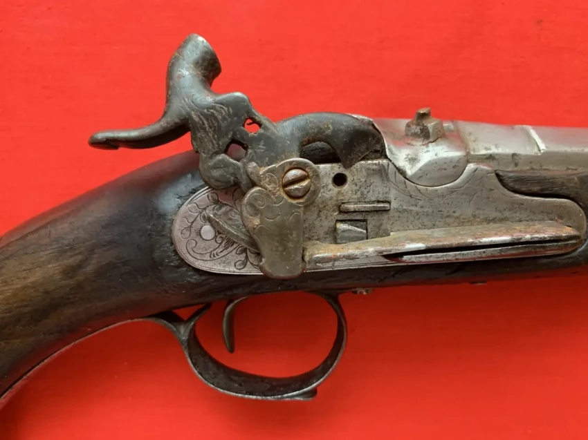 Вот он, этот пистолет, о котором пойдет речь. Он капсюльный, но вот замок у него от кремневого пистолета. Вес 1 кг. Калибр 15,7-мм. Фотография автора