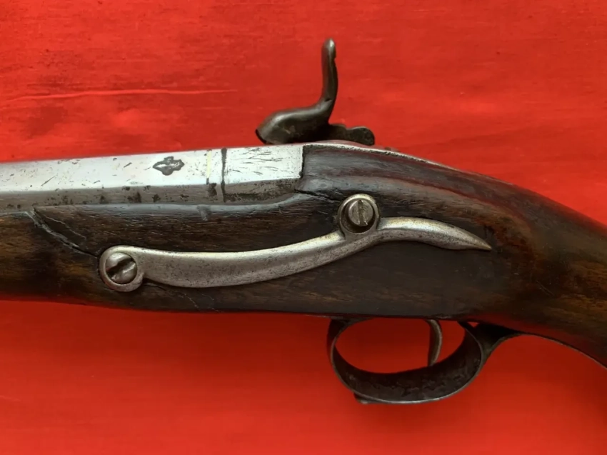 А ударно-спусковой механизм с курком в виде папиллы и римского замка использовался в пистолетах и охотничьих ружьях вплоть до появления огнестрельного оружия под унитарные патроны. На этих ударно-спусковых механизмах с курком в виде папиллы часто изображали диких животных (львов, собак, мифических зверей или рыб). Микелеты, выполненные в таком стиле, особенно часто встречались у испанских оружейников из Эйбара. Скорее всего, и этот пистолет также их работа. Причем курок явно сделан из другого металла, нежели замочная полка, хотя, видимо, он и копировал форму предшествующего ему замка с губками для удержания кремня. Из-за положения брандтрубки его также пришлось делать изогнутым!