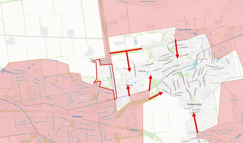 В Красноармейске, продолжаются городские бои, идёт зачистка заблокированных украинских очагов с террористами. Украинские подразделения жалуются на плотный туман, который практически лишил их возможности использовать беспилотники. Российские подразделения, напротив, используют погодные условия как прикрытие для наземных манёвров и зачисток зданий. По словам начальника Генштаба, под контролем российских сил уже около семидесяти процентов города. Бои продолжаются в Димитрове, а также в районах Родинского и Шахово, хотя подробных данных оттуда пока не поступает. Фиксируется плотная работа авиации по заблокированным боевикам в городе.