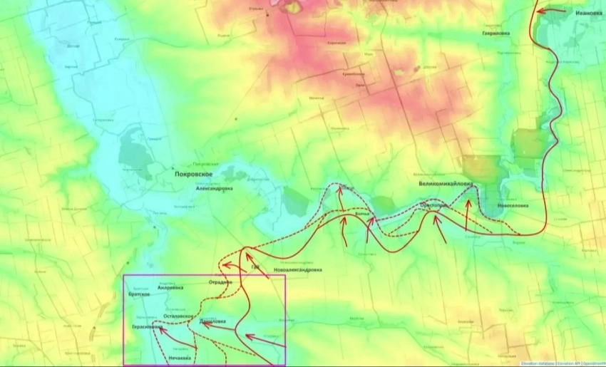 Севернее российские бойцы прорывают рубеж реки Гайчур, развивая наступление на Герасимовку и Остаповское, где уже идут бои. Частично занято Отрадное. Выход на линию Андреевка - Братское обеспечит надежный левый фланг для масштабного наступления на Покровское.