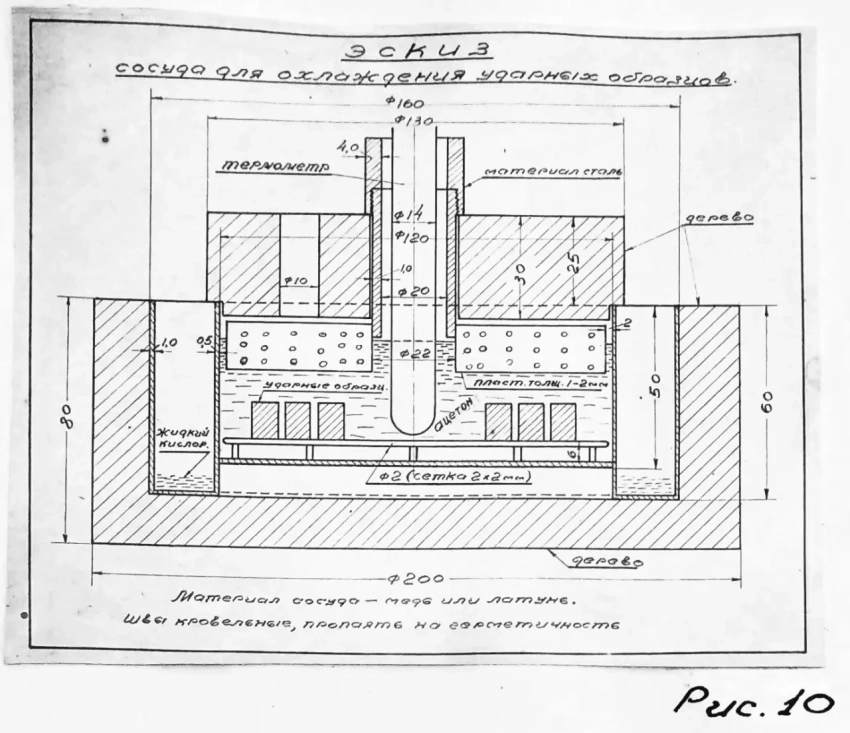 В кольцевой сосуд, окружающий внутреннее отделение, небольшими порциями вливается жидкий кислород. По достижении заданной температуры во внутреннее отделение помещается необходимое число образцов. Выдержка давалась 25 мин.