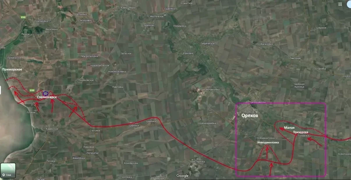 В данный момент идет работа по расширению плацдарма для соединения с частями, совершившими прорыв в районе Малой Токмачки. Главная тактическая задача - ликвидация «кармана» между этими выступами, что позволит подтянуть расчеты БПЛА и начать непосредственные городские бои в Орехове.