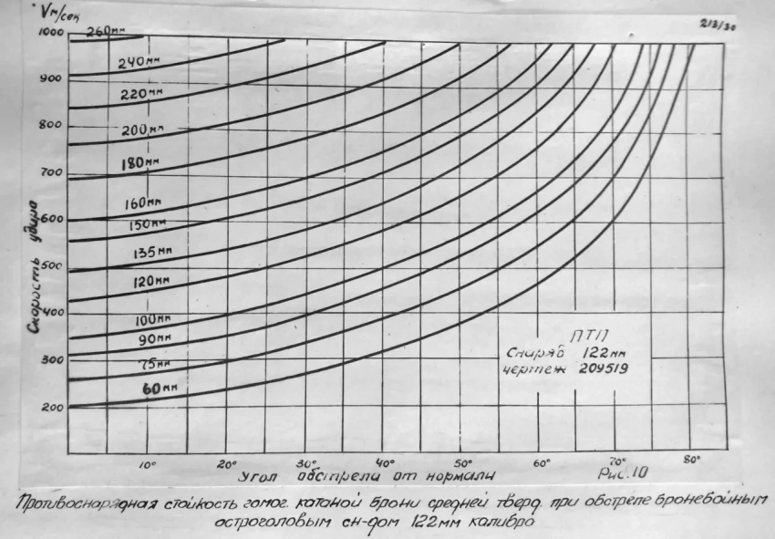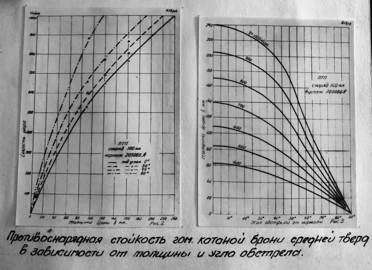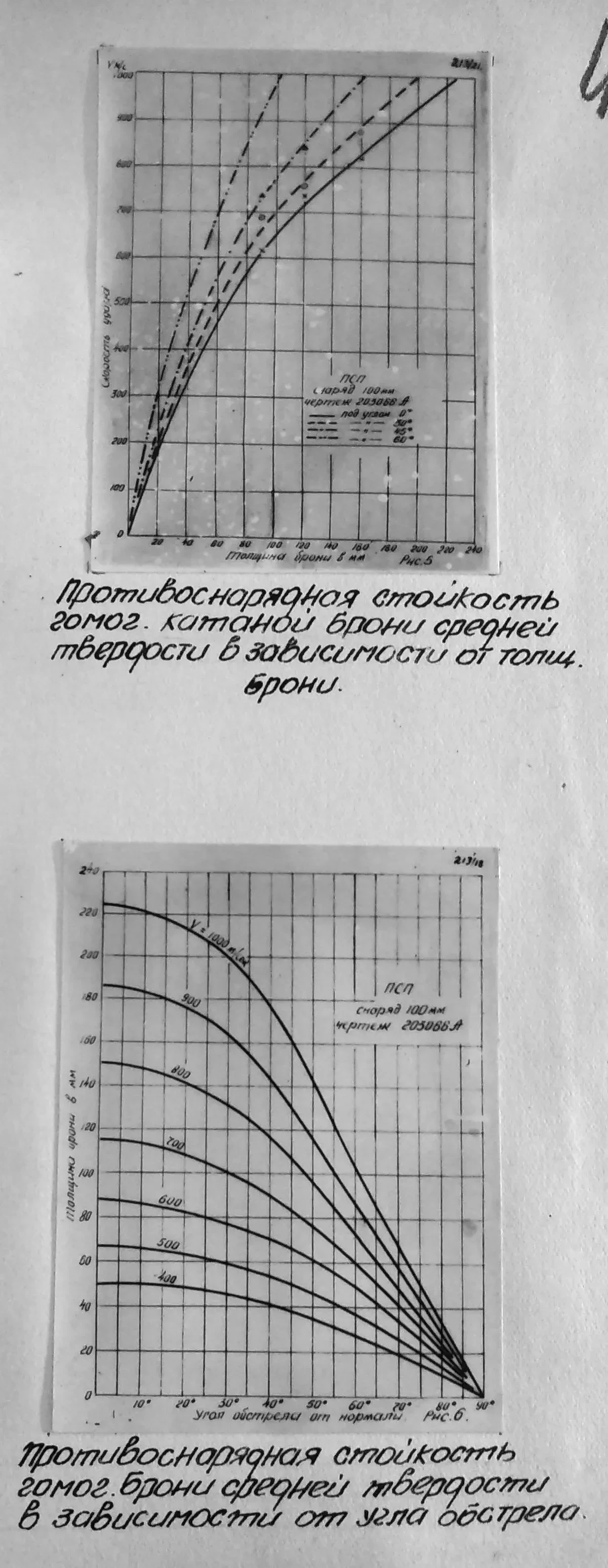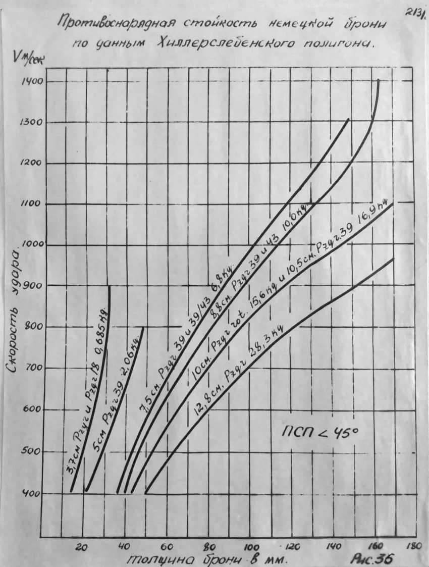 Однако, используя трофейные материалы Хиллерслебенского полигона, подробно о которых будет сказано ниже, данные Кубинского полигона по испытанию опытного объекта «260» немецкими 128-мм снарядами и имеющиеся данные по обстрелу отечественной брони немецкими снарядами меньших калибров, расчетным путем были получены тактические диаграммы противоснарядной стойкости отечественной гомогенной брони также против снарядов и этого калибра.