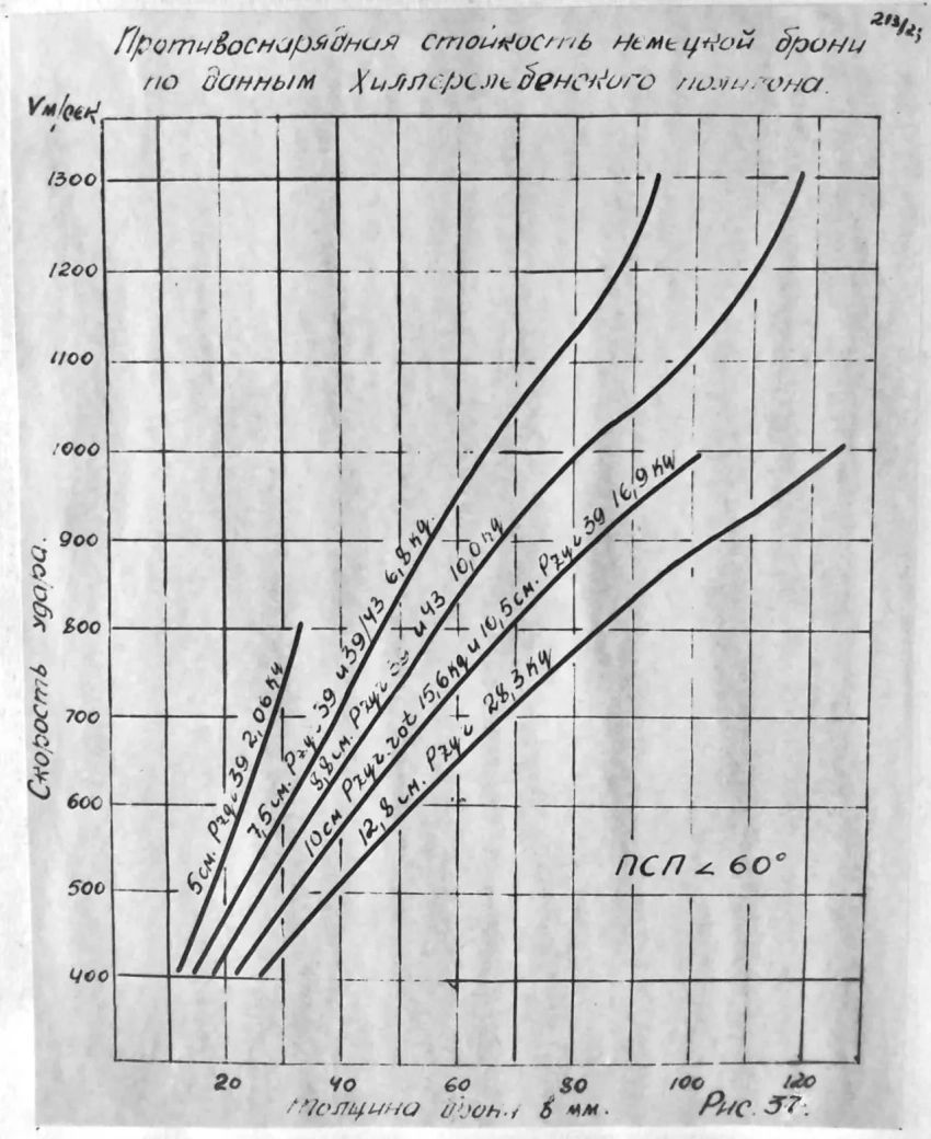 Прежде чем приступить к рассмотрению этих данных, следует отметить, что материалы Хиллерслебенского полигона, полученные из Арткома ГАУ ВС, представлены исключительно в виде графического материала, отражающего только противоснарядную стойкость немецкой брони под огнем их же противотанковой артиллерии, без какого-либо пояснительного текста, на основании которых возможно было бы установить некоторые сведения о свойствах немецкой брони и пр.