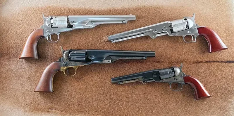 Второе поколение револьверов Кольта из револьверов 1851 и 1860 года: тип «морской» 1851 года из нержавеющей стали (вверху слева) и с вороненым покрытием (внизу слева), а также армейских револьверов 1860 года и карманных «морских» револьверов 1862 года (справа) с отделкой воронением