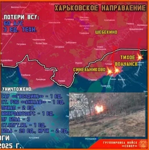В районе Лимана взяты три опорника ВСУ, продвижение 600 м; в Вильче - до 400 м. У Чернякова огневым ударом уничтожен пункт управления 1-й пограничной комендатуры ГПСУ, ликвидирован начальник комендатуры (капитан). На Липцовском участке артиллерия и FPV-дроны бьют по маршрутам снабжения ВСУ, уничтожая транспорт и наземных роботов.