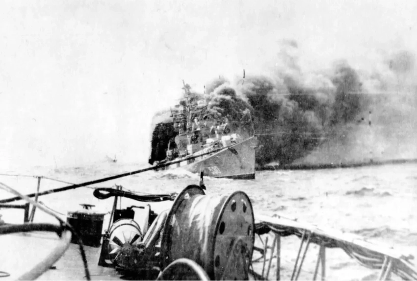 Буксировка «Отважного», вид с кормы «Бедового»