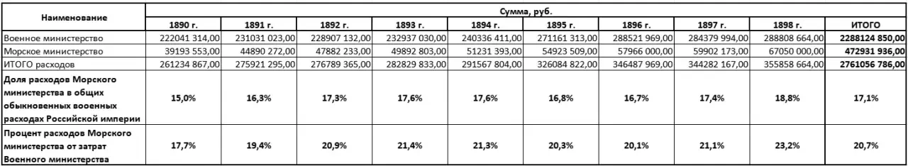 То есть в период 1890-1898 гг., когда Российская империя осуществляла весьма значительные кораблестроительные программы, которые вывели ее в разряд первоклассных военно-морских держав, расходы на флот составили аж 17,1% общих военных расходов и 20,7% от суммы расходов Военного министерства!