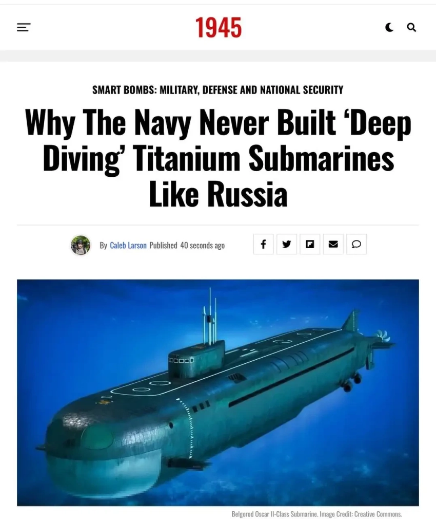 Не так давно на американском околооборонном сайте 19fortyfive.com вышел материал Калеба Ларсона с броским заголовком: «Почему ВМС никогда не строили титановых глубоководных субмарин, как Россия». Заголовок броский, но ответа на данный вопрос Ларсон в своём тексте не даёт, просто констатирует: да, русские построили энное количество подлодок с титановыми корпусами, побившие пару мировых рекордов в скорости и глубине погружения, а американцы довольствуются простыми стальными корпусами, используя титан только для отдельных деталей. Ну и в медицине. Наверное, не нужно это американским ВМС (интересно самомнение Ларсона — он пишет Navy, не уточняя, что это US Navy, типа: а что, в мире есть ещё какие-то Navy?). Что ж, если американский автор ответа на данный вопрос не даёт, придётся мне немного помучить клавиатуру...