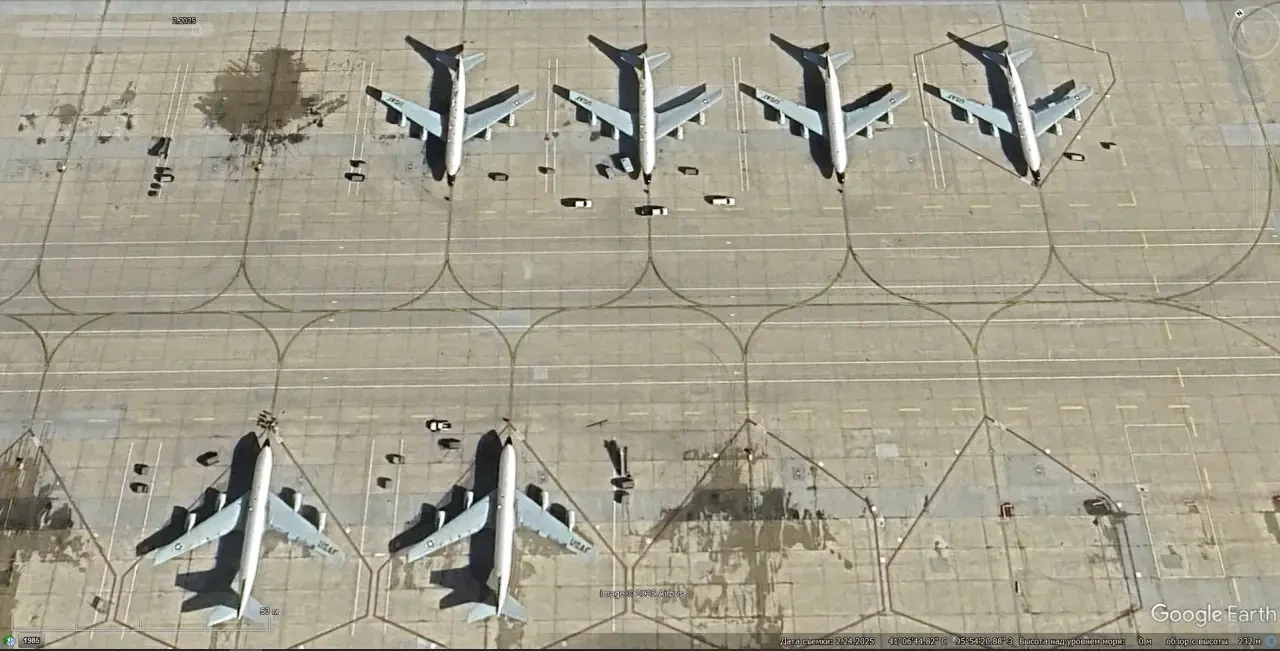 Спутниковый снимок Google Earth: самолёт ДРЛО Boeing E-3G Sentry и самолёты-заправщики Boeing KC-135 на авиабазе Милденхолл в Великобритании. Снимок сделан в июне 2022 года