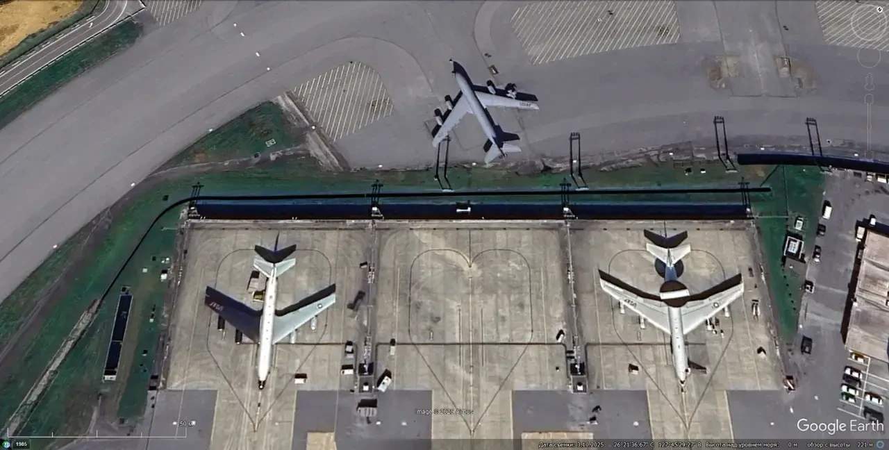 Спутниковый снимок Google Earth: разведывательные самолёты Boeing RC-135 различных модификаций на авиабазе Оффут