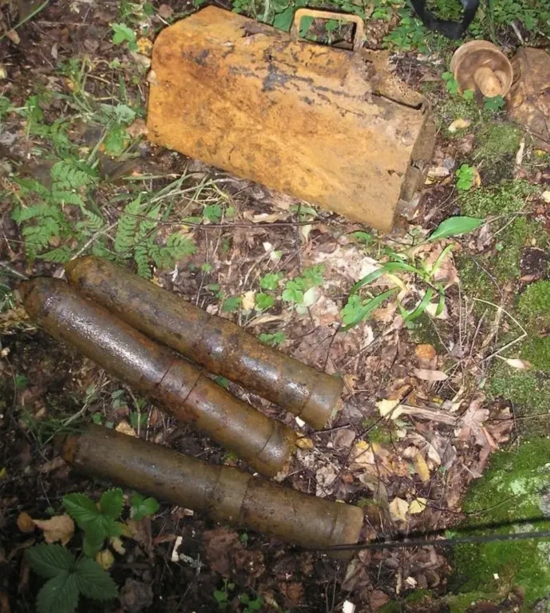 73-мм агитационные гранаты рядом с коробом для них (найдены при раскопе)