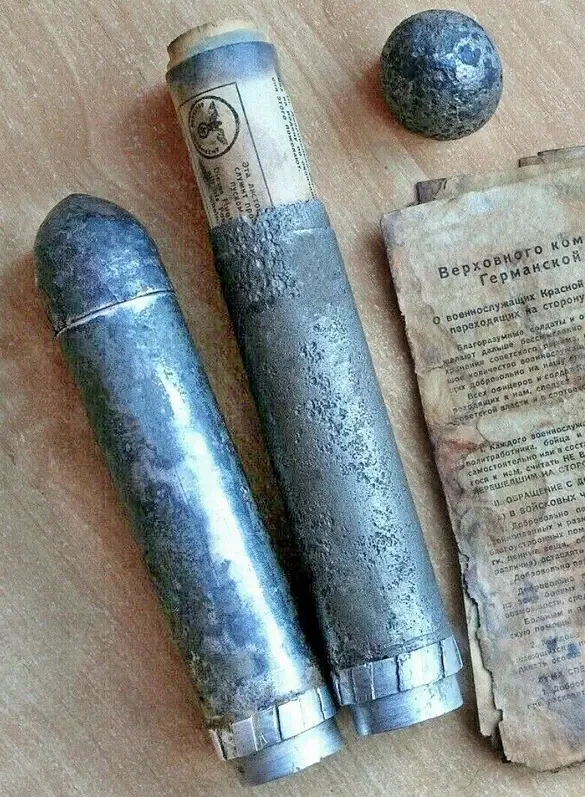Во Второй мировой войне главным агитационным боеприпасом у немцев был 105-мм агитационный снаряд. Внизу снаряд был окрашен в красный цвет, а наверху – в белый.