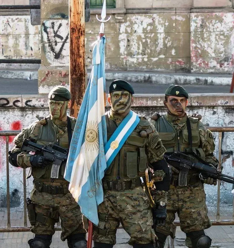 Спецподразделения? Они были, но давайте не будем о грустном? Флот пытался воссоздавать итальянскую 10-ю флотилию MAS (получилось совсем плохо!), ВВС — британскую SAS (вышло не лучше), жандармерия — эскадрон специального назначения «Аларкан» («Скорпион» по-русски) (название оказалось сильно страшнее действительности). Наиболее подготовленными были роты горных егерей, сформированные из андских индейцев, но их на Фолклендах не задействовали. Все остальные «коммандос» были теми же срочниками, прошедшими дополнительную подготовку в месяц или чуть больше.