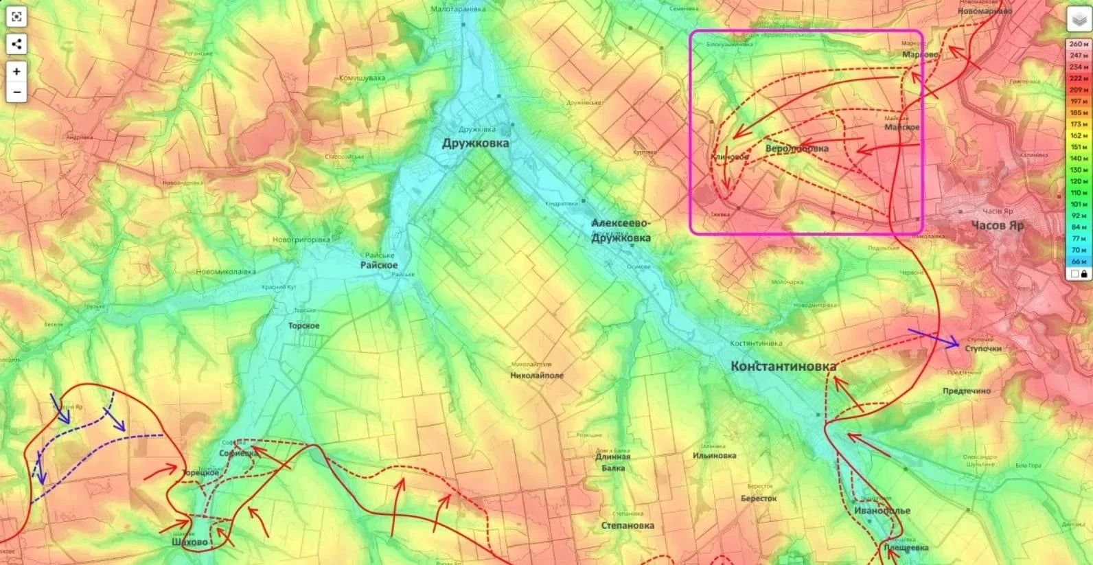 В результате успешных наступательных действий армия России вышла к населённому пункту Резниковка с северо-востока. От его западной части до Славянска по прямой менее 20 км. Таким образом, можно констатировать, что радиус охвата Славянско-Краматорской агломерации сокращается. По противнику в Краматорске уже активно работают FPV-дроны, нарушая его логистику.