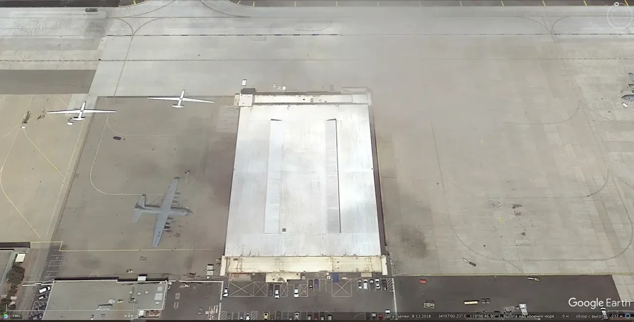 Спутниковый снимок Google Еаrth: базовые патрульный самолёт Lockheed P-3 Orion, самолёт ДРЛО раннего выпуска P-3 AEW, военно-транспортные Lockheed C-130Н Hercules и истребители Hawker Hunter на авиабазе Пойнт-Мугу