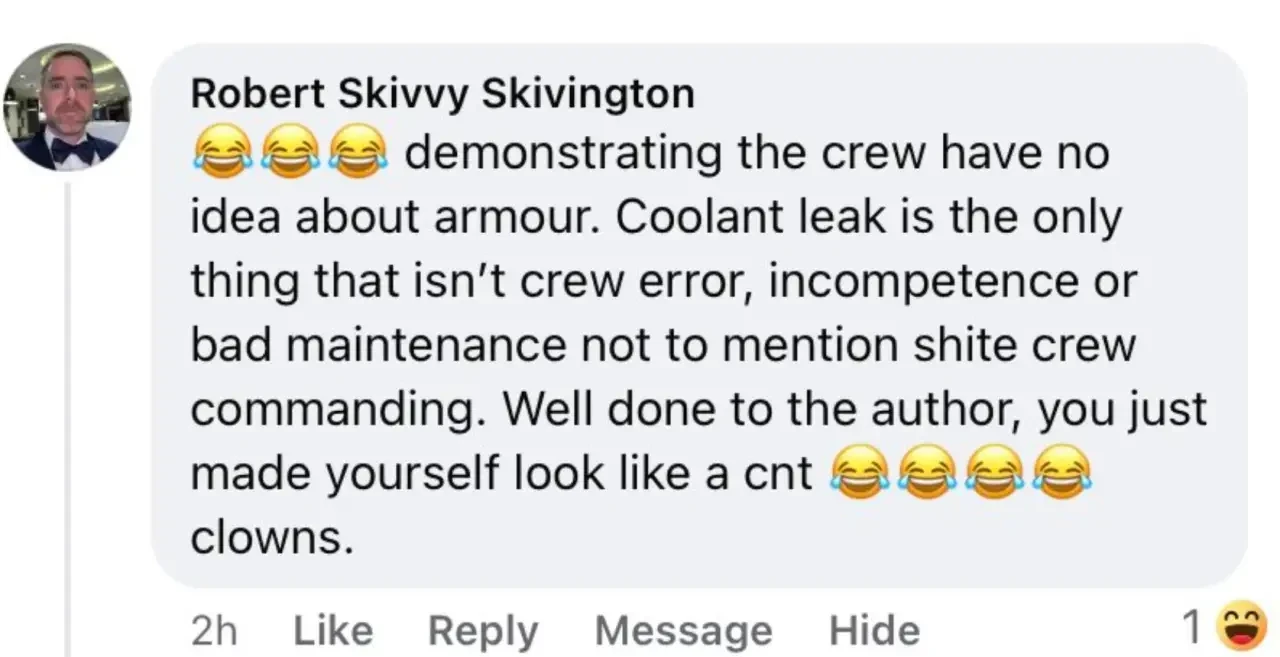 «...демонстрируя, что экипаж вообще ничего не понимает в бронетехнике. Утечка охлаждающей жидкости — единственное, что здесь не является ошибкой экипажа, некомпетентностью или плохим обслуживанием, не говоря уже о дерьмовом командовании экипажем. Браво автору — ты только что выставил себя полным клоуном...»