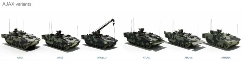 Само семейство будущих машин, названное впоследствии «Аякс», включало в себя шесть типов изделий на единой платформе: разведывательно-ударную машину «Аякс» с 40-мм автоматической пушкой, бронетранспортёр «Арес», командно-штабную машину «Афина», ремонтную машину «Аполлон», БРЭМ «Атлас» и инженерно-разведывательную машину «Аргус».