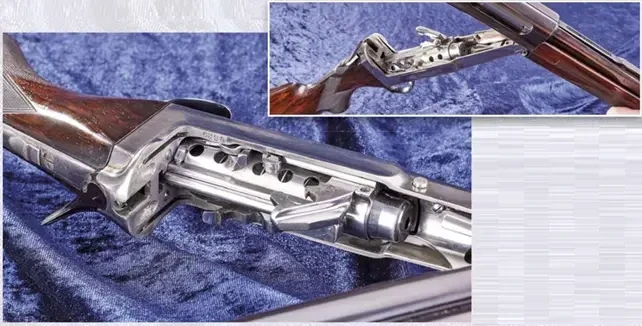 Но и это ещё не всё о заряжании. После того как магазин ружья опустошен, затвор остаётся в заднем положении. Тогда можно просто вложить патрон сбоку через окно выброса. Нажатие на кнопку, расположенную снаружи слева внизу на ствольной коробке, освобождает затвор, и он, захватывая патрон, движется вперёд. После этого ружьё снова можно переломить и заново заполнить магазин описанным способом.