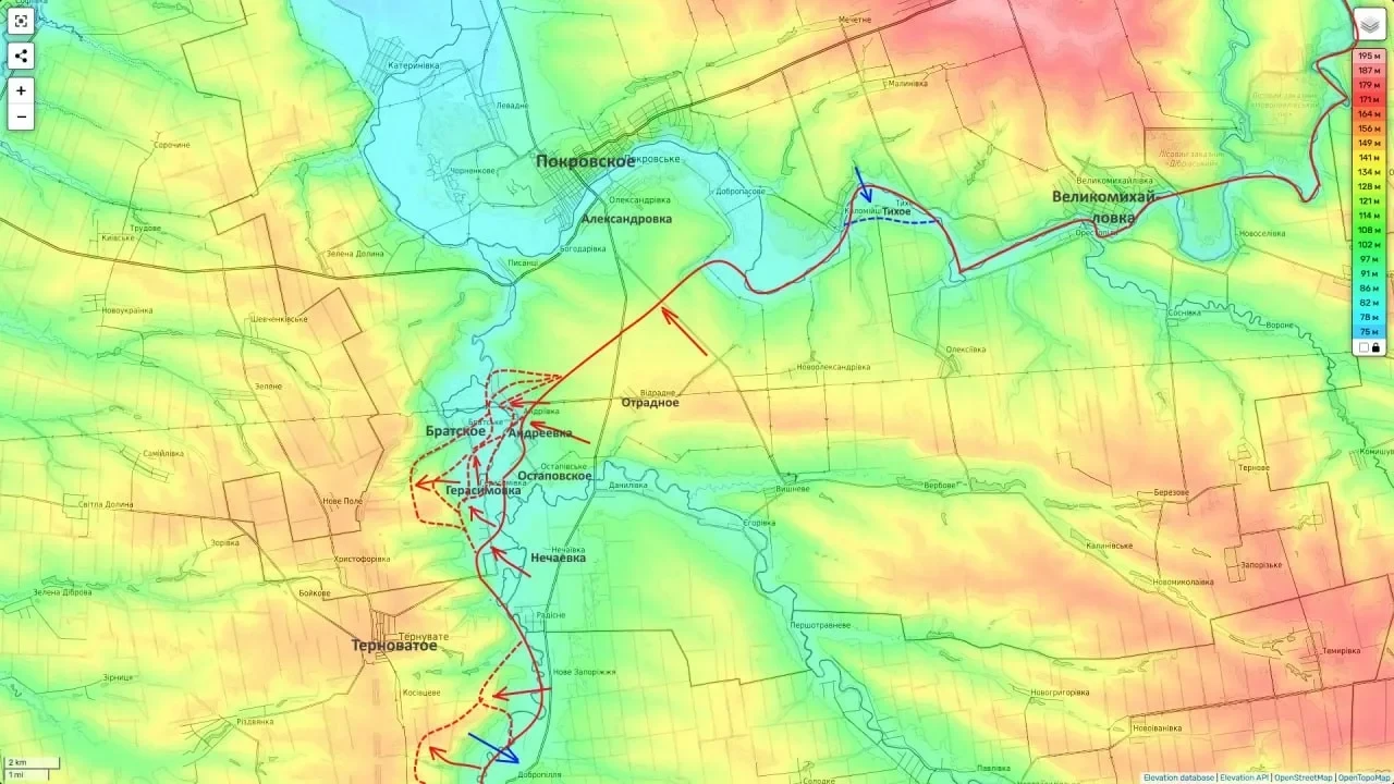 По его данным, ВС РФ расширили плацдарм на западном берегу реки Гайчур севернее Терноватого, а также существенно продвинулись к юго-востоку от населённого пункта. В результате два ранее разрозненных плацдарма фактически объединены в единый опорный район, имеющий уже не локальное, а оперативно-тактическое значение.