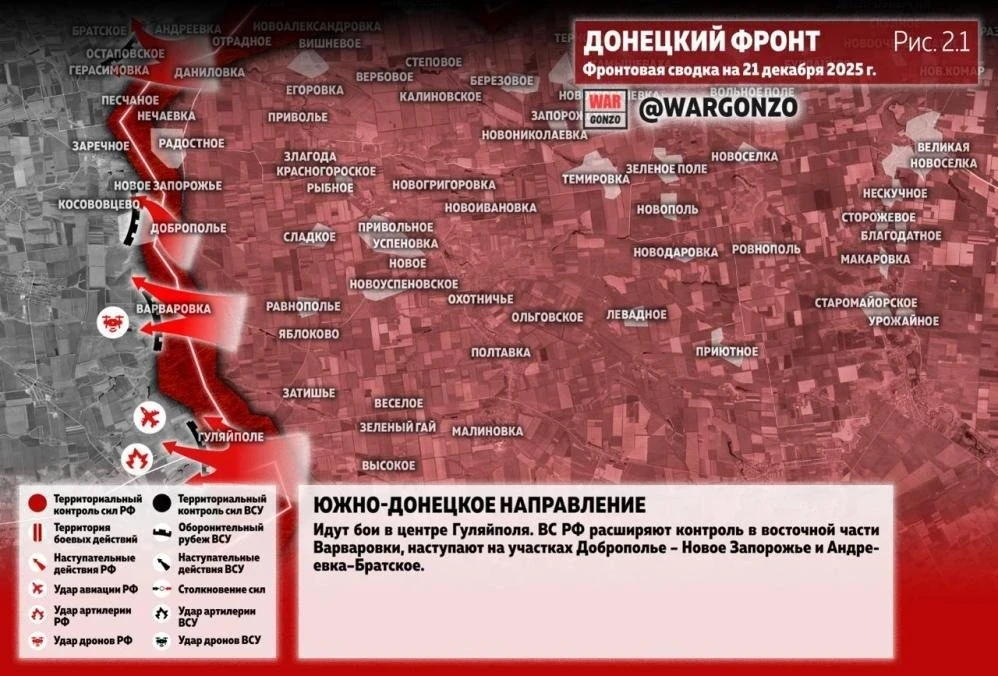 Карта боевых действий на Украине. Ситуация в зоне СВО на 21.12.2025