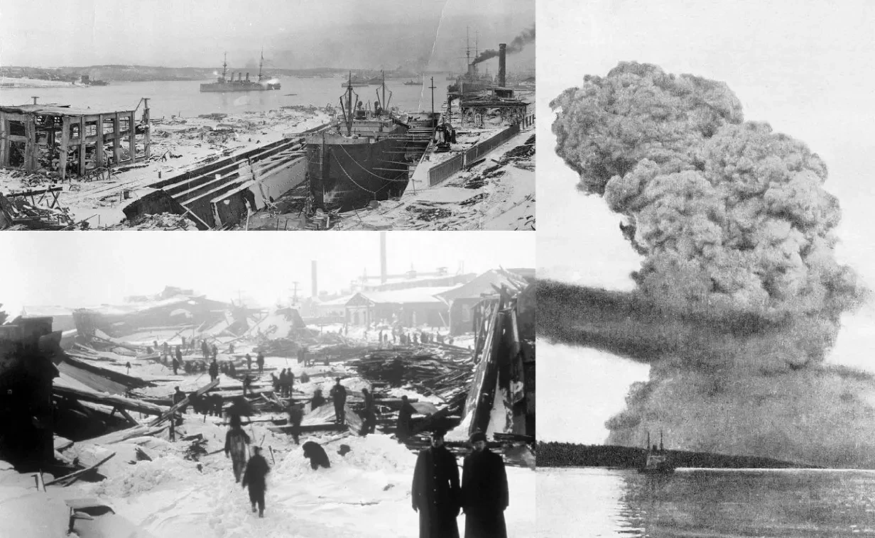 Последствия взрыва парохода в порту Галифакса. Груз парохода составляли 2300 тонн мокрой и сухой пикриновой кислоты, 500 тонн тротила, 10 тонн пироксилина и 35 тонн бензола в бочках. Взрывом и последовавшими за ним пожарами было полностью уничтожено 1630 домов, ещё 12 000 существенно повреждено