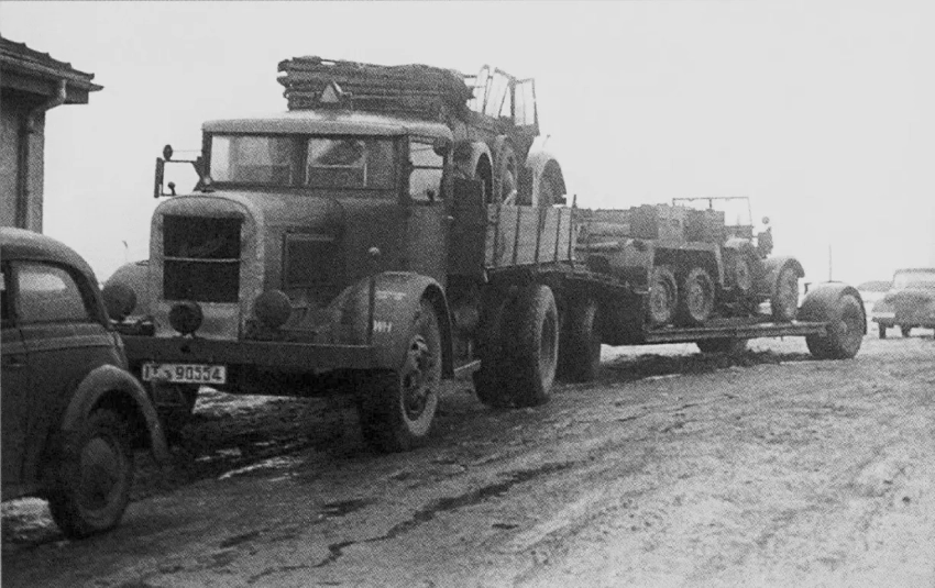 На фотографиях запечатлён эпизод работы немецкого эвакуатора. Легковой автомобиль офицера Люфтваффе вышел из строя и теперь эвакуируется с помощью одного из тяжёлых низкорамных прицепов вермахта – Sd.Ah. 115 в 10-тонном варианте. Sd.Ah. 115 (Sonderanhänger 115 – специальный прицеп 115) – это тяжёлый низкорамный трал, разработанный фирмой Goldhofer и производившийся с 1937 года. 10-тонная версия предназначалась для перевозки лёгкой и средней бронетехники, повреждённых автомобилей и тяжёлых грузов. Прицеп имел низкую погрузочную платформу, аппарели для заезда и мог буксироваться мощными полугусеничными тягачами (например, Sd.Kfz. 7 или Sd.Kfz. 9)
