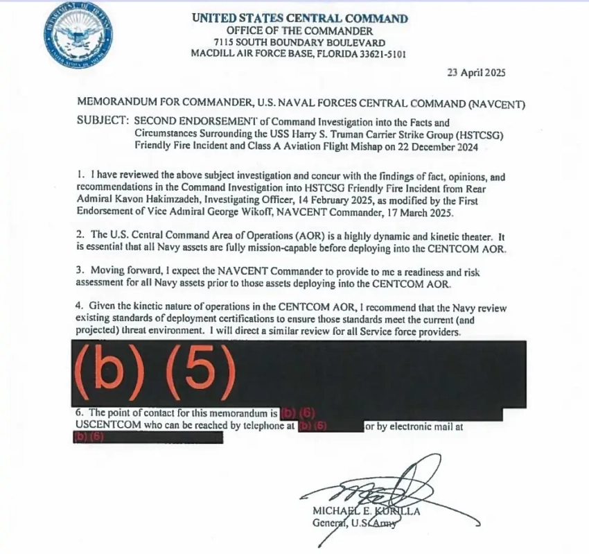На основе отчета о расследовании «Command Investigation into the Facts and Circumstances Surrounding the USS Harry S. Truman Carrier Strike Group (HSTCSG) Friendly Fire Incident and Class A Aviation Flight Mishap».