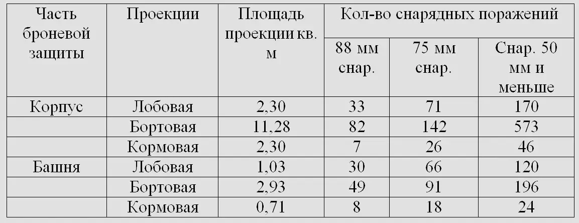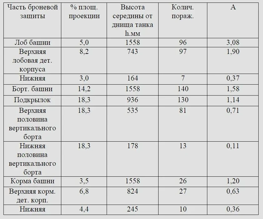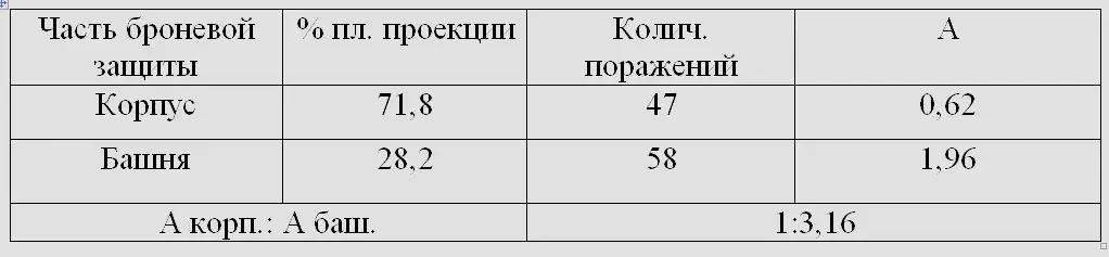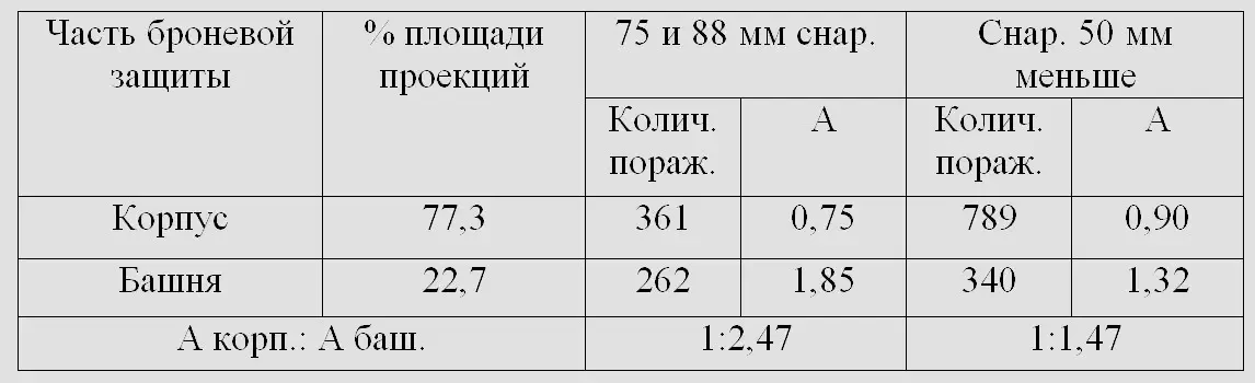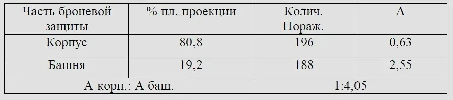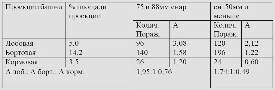 Таким образом, на единицу площади вертикальных проекций броневой защиты башни приходится поражений 75-мм и 88-мм снарядами примерно в 2,5 раза и снарядами калибров 50-мм и меньше — примерно в 1,5 раза больше, чем на единицу площади вертикальных проекций броневой защиты корпуса.