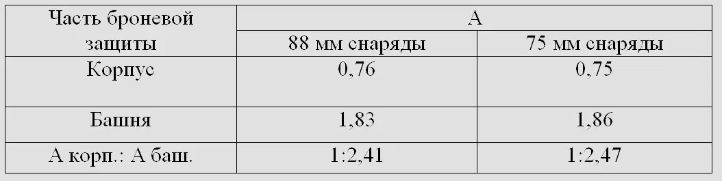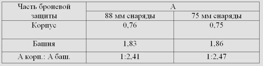 По наиболее интересующим нас калибрам снарядов 75 мм и 88 мм получается, что интенсивность обстрела лобовой проекции башни почти вдвое превышает интенсивность обстрела бортовой проекции башни, а интенсивность обстрела кормовой проекции близка к ней.