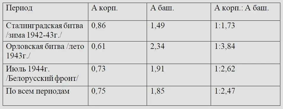 Из таблицы видно, что период Сталинградской битвы характеризуется наиболее равномерным распределением снарядных поражений между корпусом и башней танка. Однако и в этом случае интенсивность обстрела башни почти вдвое превышает интенсивность обстрела корпуса.
