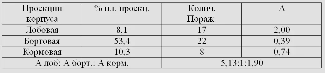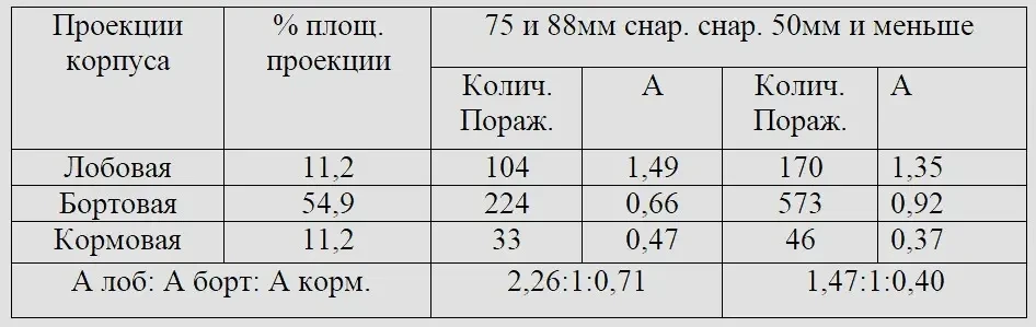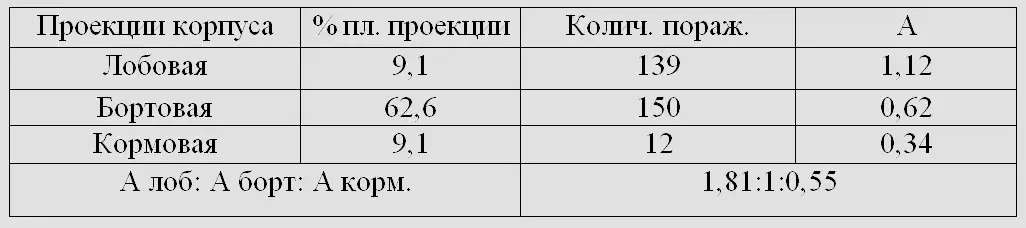 Распределение снарядных поражений между лобовой, бортовой и кормовой проекциями корпуса и относительные удельные снарядные нагрузки «А» на эти проекции представлены в таблице ниже.
