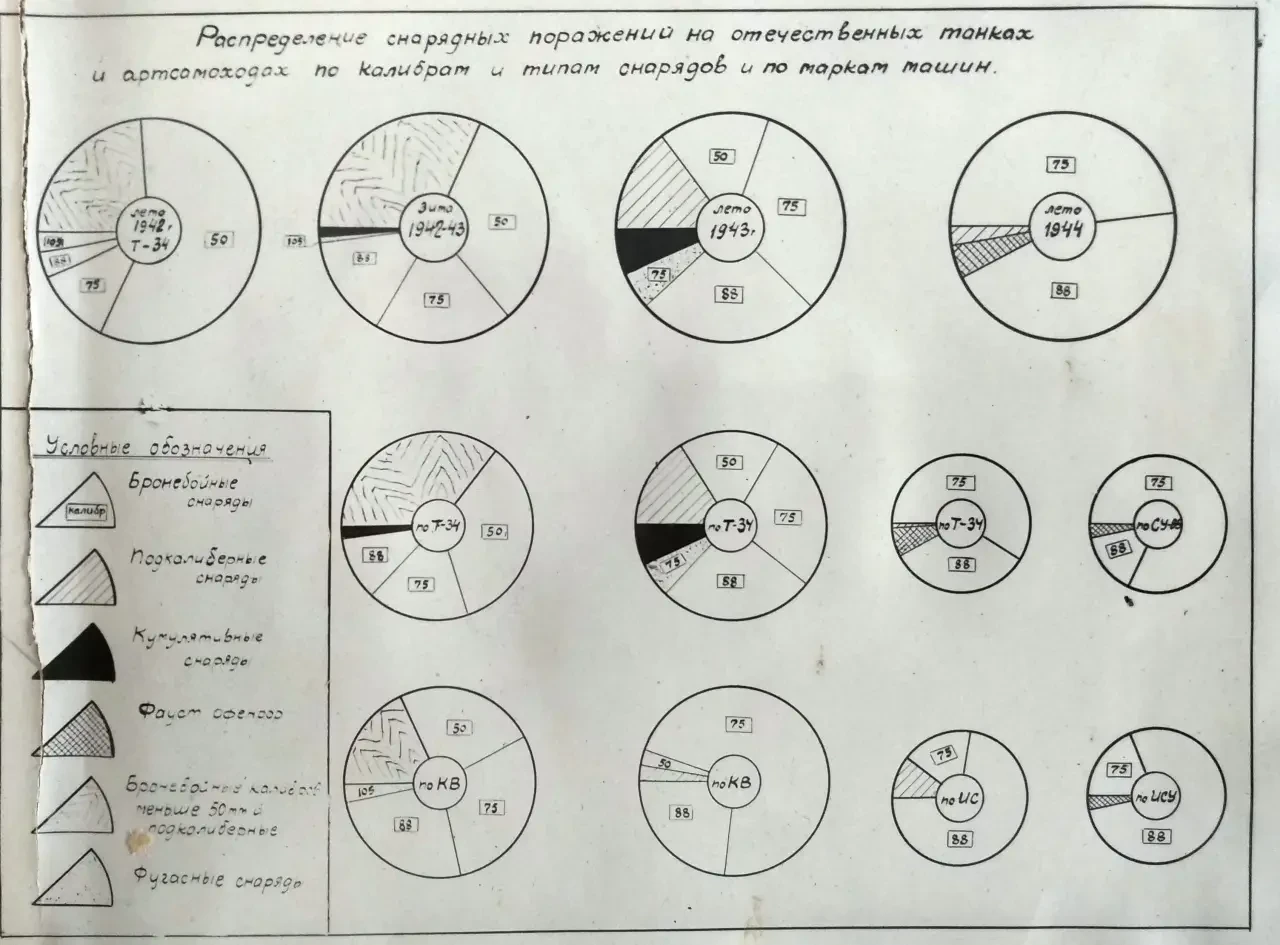 Анализ показывает, что состав немецкой танковой и противотанковой артиллерии по мере перехода от 1942 г. к 1944 г. коренным образом изменился. Если в 1942 г. на калибры 50 мм и меньше приходится более 70%, а зимой 1942-1943 г. более 60% всех поражений, то летом 1943 г. на эти калибры приходится всего только около 30% поражений, и летом 1944 г. поражений снарядами этих калибров уже совсем нет, в то же время снарядами калибров 75 и 88 мм нанесено поражений в 1942 г. около 15%, зимой 1942-43 г. около 35%, летом 1943 г. около 60% и летом 1944 г. более 90%.