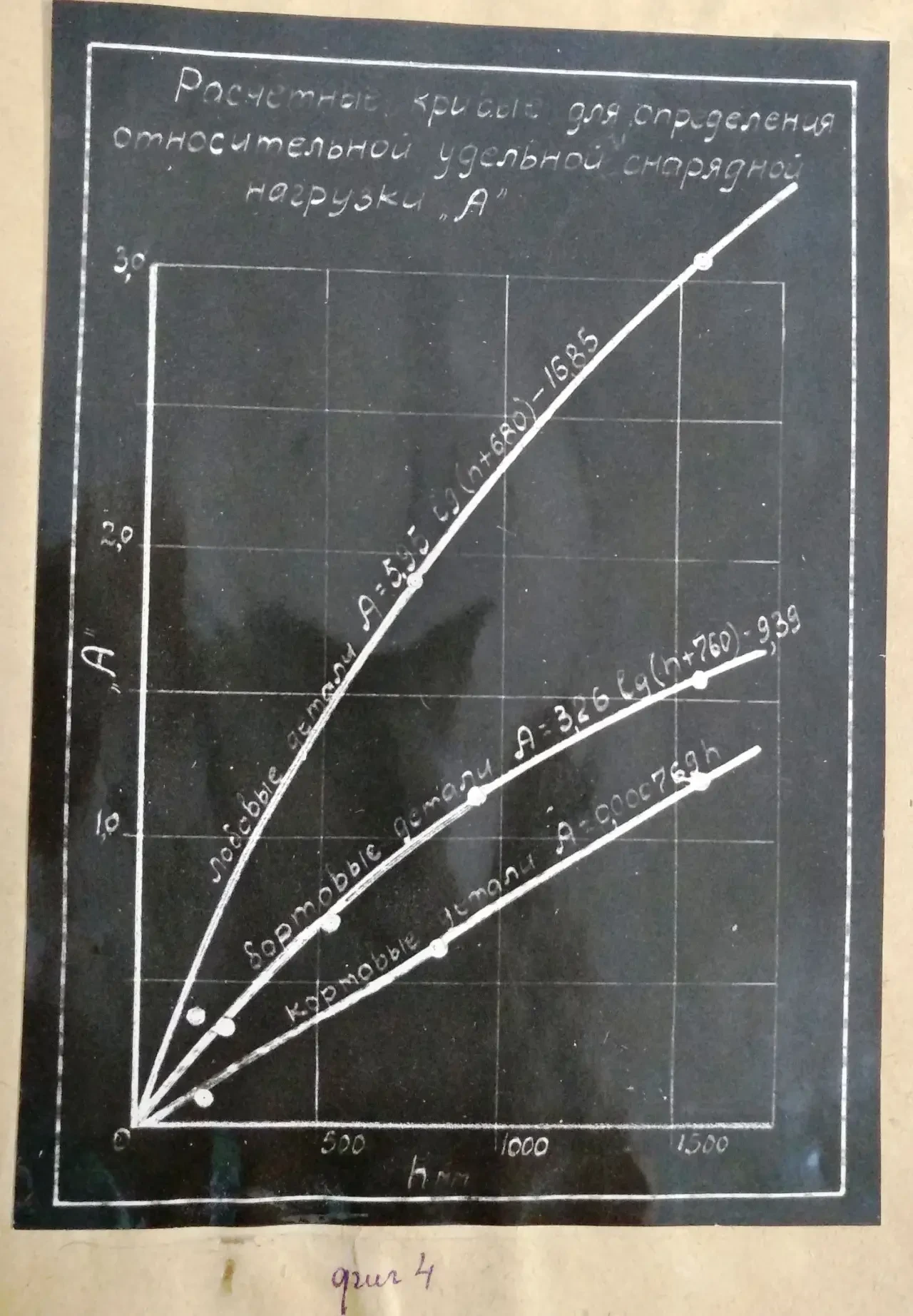 Однако в таком виде, как они представлены на фиг. 3, эти кривые не совсем хороши для расчетов, желательно иметь такие расчетные кривые, которые удовлетворяли бы требованию А = 0 при h = 0, т. е. проходили бы через начало координат. Естественно, что для получения таких кривых придется значительно отступить от практических точек фиг. При этом лучше, конечно, кривые провести через точки, соответствующие большим значениям h, и пренебречь точками, соответствующими очень малым значениям h, тем более, что расположение этих точек не вполне логично /кривая кормовых деталей пересекает кривую бортовых деталей/.