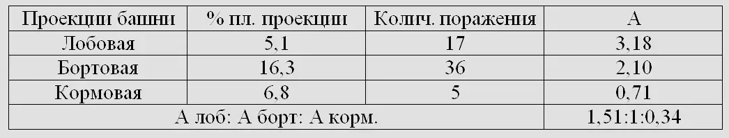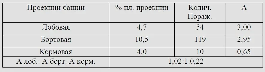 Распределение снарядных поражений между лобовой, бортовой и кормовой проекциями башни и относительные удельные снарядные нагрузки «А» на эти проекции представлены в таблице ниже.