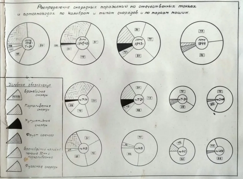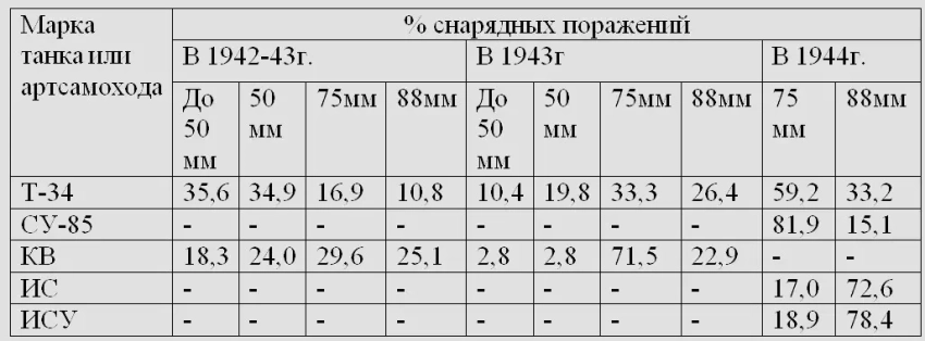Поражений кумулятивными снарядами в 1942 г. не отмечено, 1942-1943 г. они составляли не более 2%, в 1943 г. — не более 7% и в 1944 г. поражений этими снарядами не отмечено.
