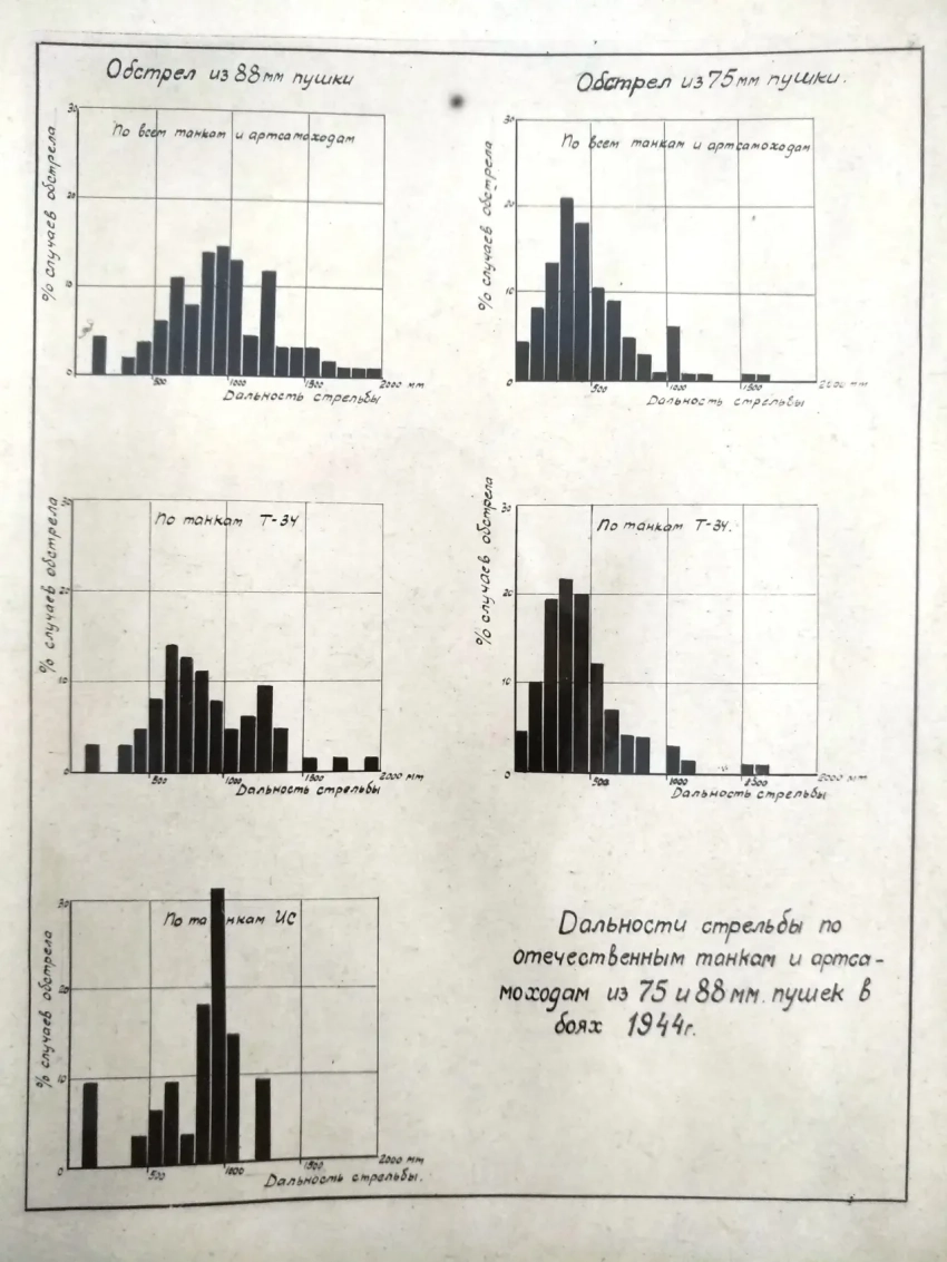 В результате обследований, проделанных в 1944 году на 1-м Украинском и 1-м Белорусском фронтах, по большему количеству танков и артсамоходов зафиксированы дальности их обстрела немецкой танковой и противотанковой артиллерией. Эти данные предоставляют чрезвычайно большой практический интерес, так как по ним в настоящее время уже отрабатываются зависимости вероятности обстрела от дальности стрельбы, т. е. зависимости, которые имеют первостепенное значение в общем решении вопроса о вероятности поражения через броневую защиту танка в бою.