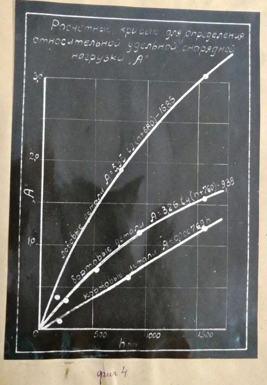 Таким образом, расчет относительной удельной снарядной нагрузки «А» может производиться или по кривым фиг. 4, или же по соответствующим этим кривым следующим формулам: