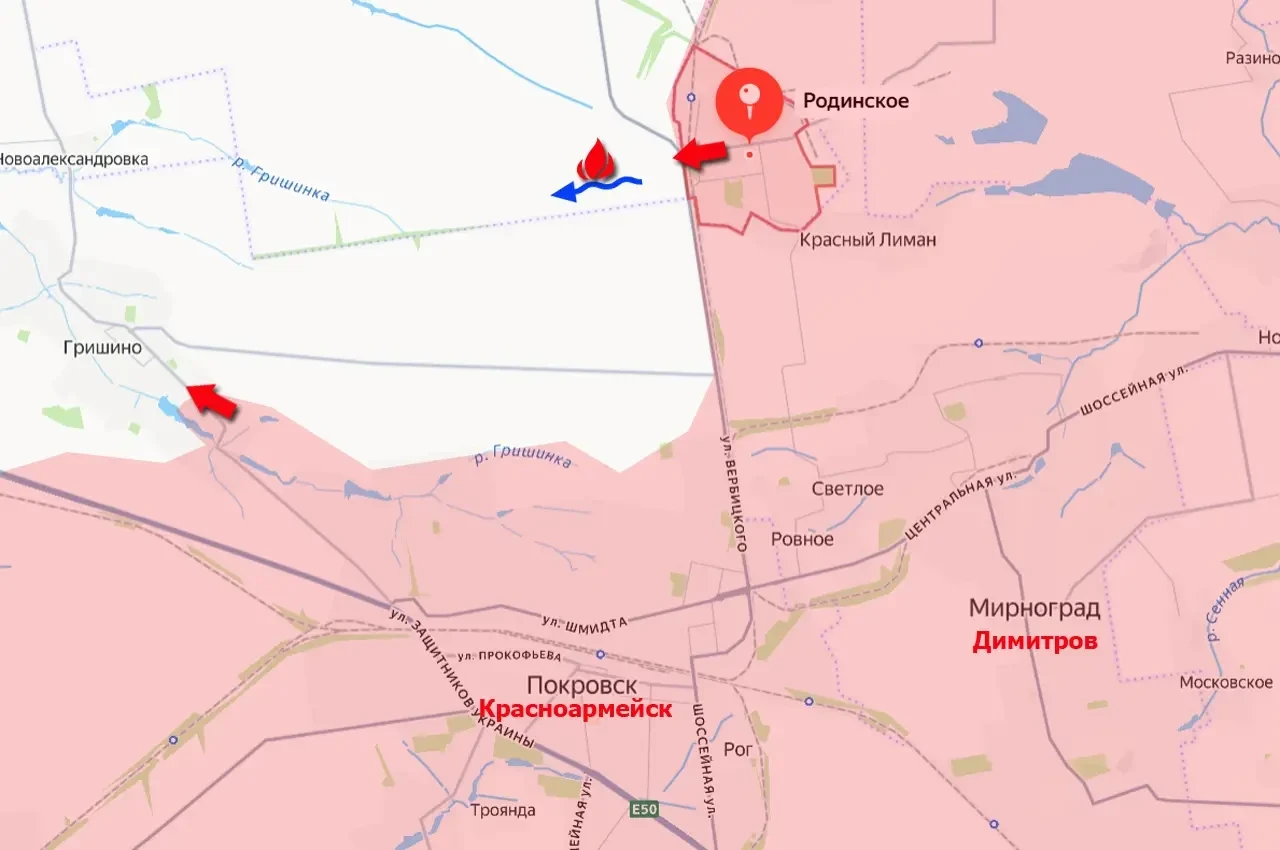 Теперь противник, который контратаковал в Родинском (те, кто уцелел), вынужден отступать в западном направлении - в сторону населённого пункта Гришино. Однако по нему наносятся удары, как наносятся они и по гарнизону в самом Гришино. Сам же этот населённый пункт противником превращён в основной узел обороны на данном направлении, хотя, безусловно, масштаб уже далеко не тот, что был в Покровске, Мирнограде и Родинском, которые, по сути, представляли собой единую оборонительную систему ВСУ.