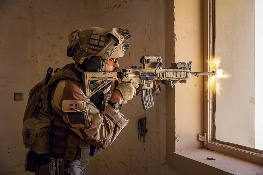 Норвежский солдат стреляет из HK416N по учебной цели на авиабазе Аль-Асад, Ирак, 13 июня 2020 года