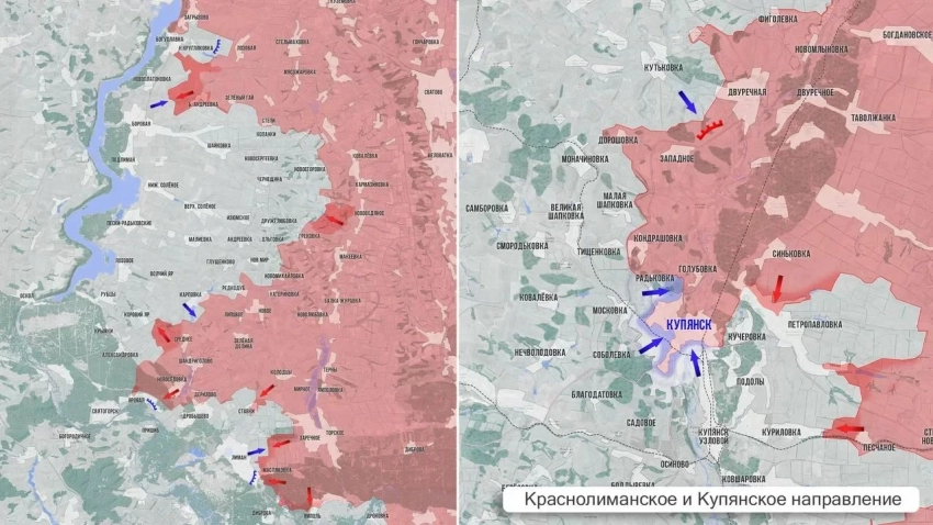 На Купянском направлении, на юго-востоке от накануне взятого под контроль села Подолы, российские войска зашли в Куриловку, взяли северную часть села и продвигаются к его западной окраине вдоль р. Лозовая. В треугольнике Новоосиново -Ковшаровка- Купянск-Узловой российские бойцы, контролируя воздушные и наземные маршруты ВСУ, уничтожают антенны и ретрансляторы, а также полевые склады вражеских расчётов БПЛА. В самом Купянске идут ожесточённые бои. Противник сумел заскочить в Кондрашовку и потеснить наших с позиций на юге. Выше по фронту ВС РФ заняли новые позиции у Двуречанского.