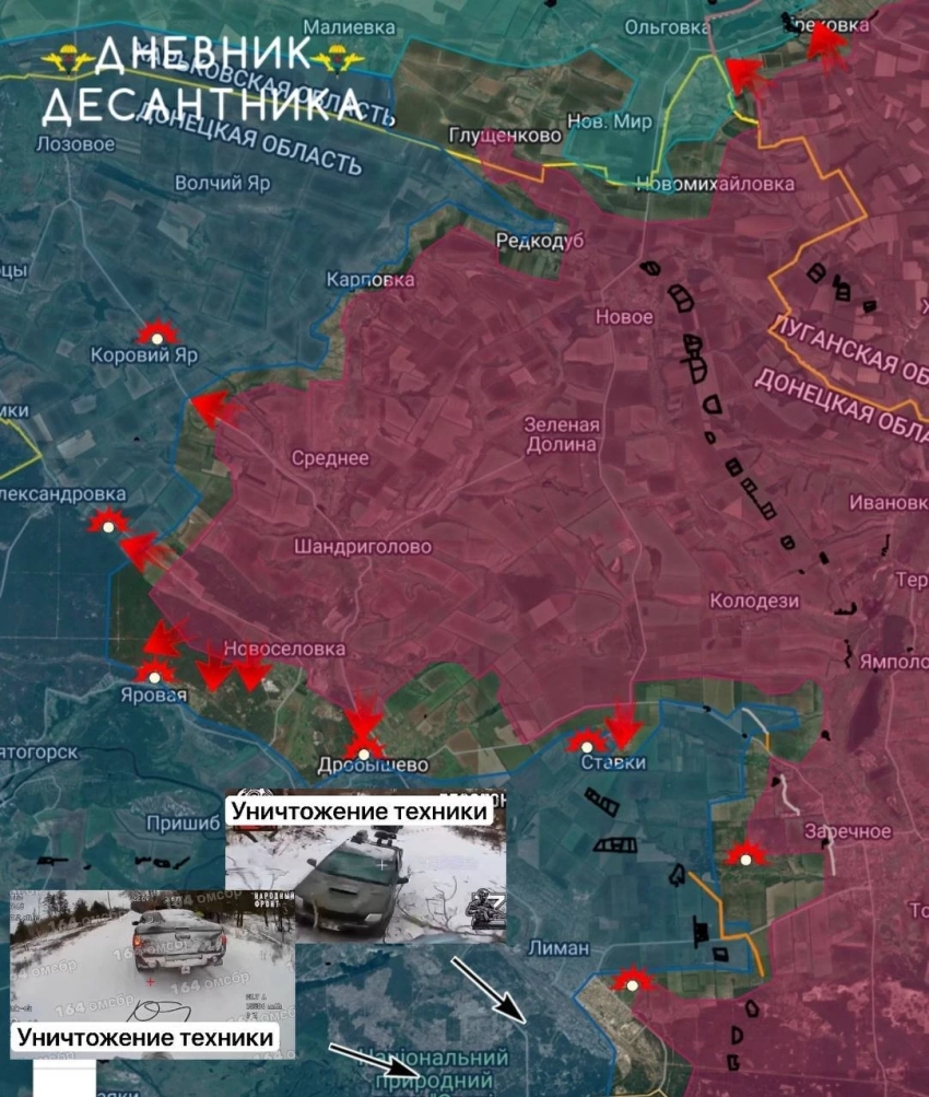 На Краснолиманском направлении ВС РФ выбивают вражескую технику на западе от Красного Лимана, в районе Стародубовской плотины. Вдоль ж/д наши пробиваются к Сосновому и станции Святогорск. К Яровой гвардейцы подошли с северо-запада и северо-востока. Идут бои за опорные пункты юго-восточнее дороги у Коровьего Яра, а также в парке «Святые Горы».