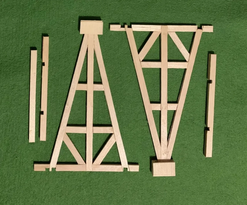 Сделать две половинки рамы очень просто: палочки накладываются на рисунок и склеиваются клеем ПВА в местах их соприкосновения друг с другом. Но такая рама будет слишком тонкой и непрочной! Поэтому на нее, как на основу, наклеиваются дополнительные «доски» с лицевой и с обратной стороны так, чтобы получился пакет из трех слоев палочек-мешалочек. Все, что у вас на раме будет лишнего, проще всего отстричь кусачками для моделирования. Это, пожалуй, в данном случае будет ваш самый главный рабочий инструмент! По этой же схеме делаются и все остальные детали, а вот рычаг это… старая засохшая кисточка! Разумеется – с поверхностью, обработанной наждачной бумагой.