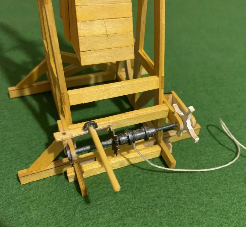 Механизм, позволяющий опускать рычаг требюше для заряжания, по своему устройству аналогичен подъемному механизму осадной башни. Это барабан, который вращается при помощи крестообразных рукояток на общей оси. Предусмотрен храповик, позволяющий ему крутиться только в одну сторону. Спуск и того проще: это Г-образная скобка на «веревке», намотанная на барабан, и пластмассовая «петля» на спусковом рычаге. В реальности все это было устроено немного по-другому, но зачем делать сложно, когда можно сделать просто, а внешний вид самоделки от этого ничуть не пострадает? Устройство пращи понятно из фотографии.