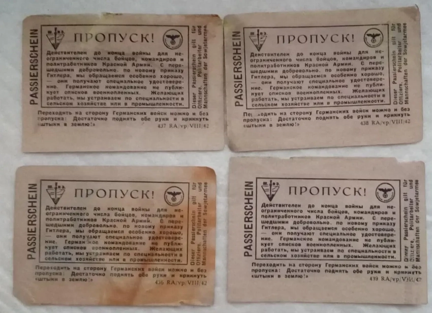 Небольшие листовки формата 7,4 х 5 см, извлечённые из пистолетной агитационной гранаты