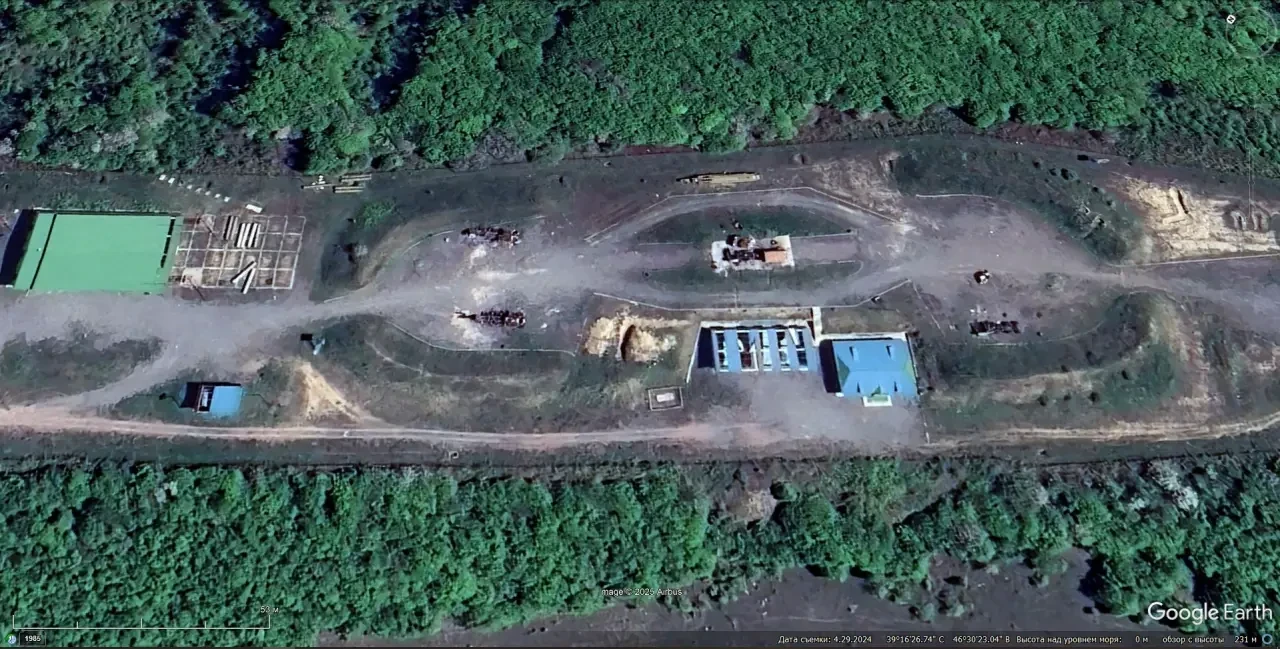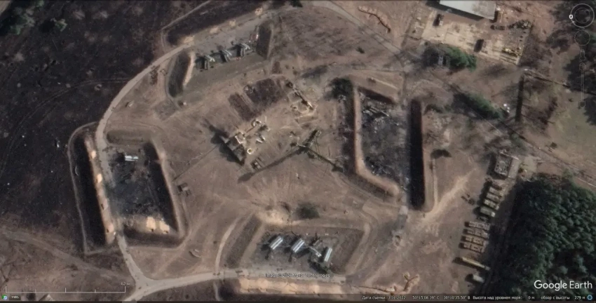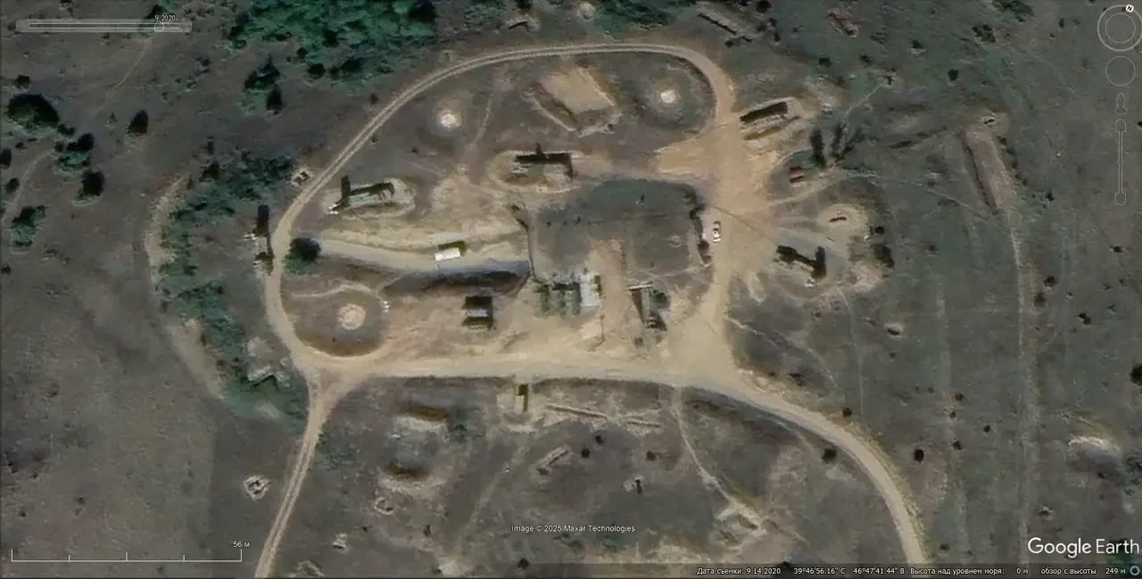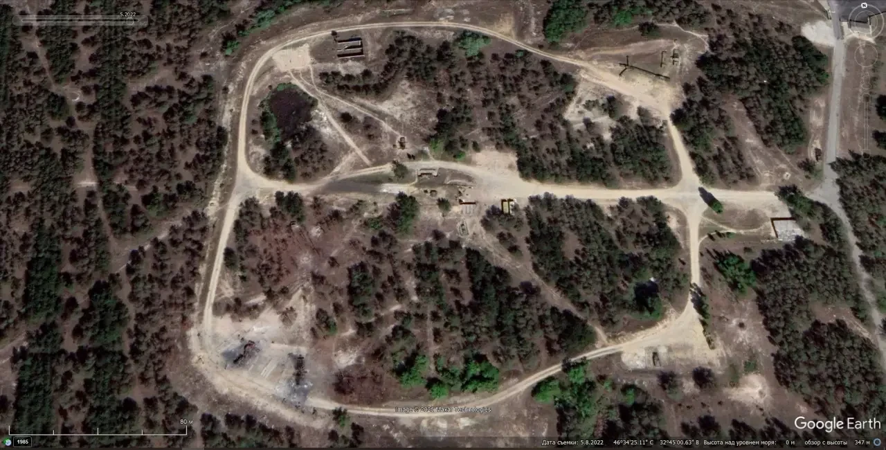 Спутниковый снимок Googlе Еarth: уничтоженная украинская ЗРС С-300ПС. На этой позиции расположенной южней города Алешки в Херсонской области до 2011 года был развёрнут дальнобойный ЗРК С-200ВМ. Снимок сделан в мае 2022 года