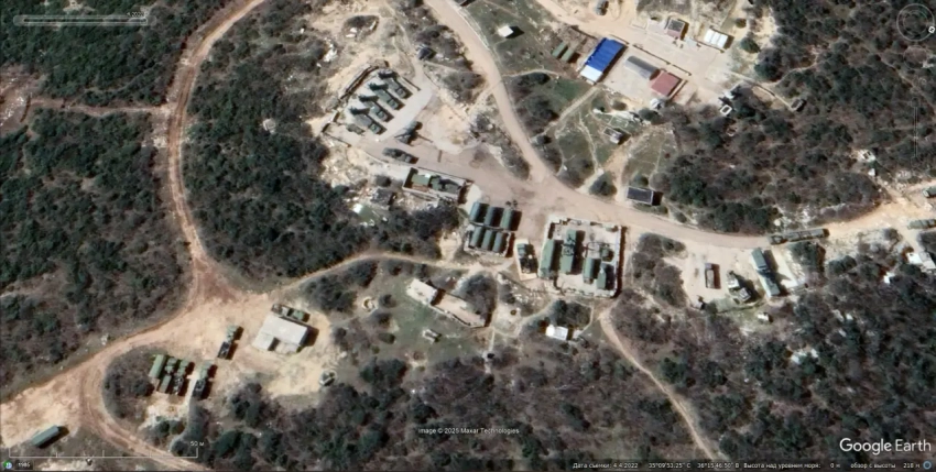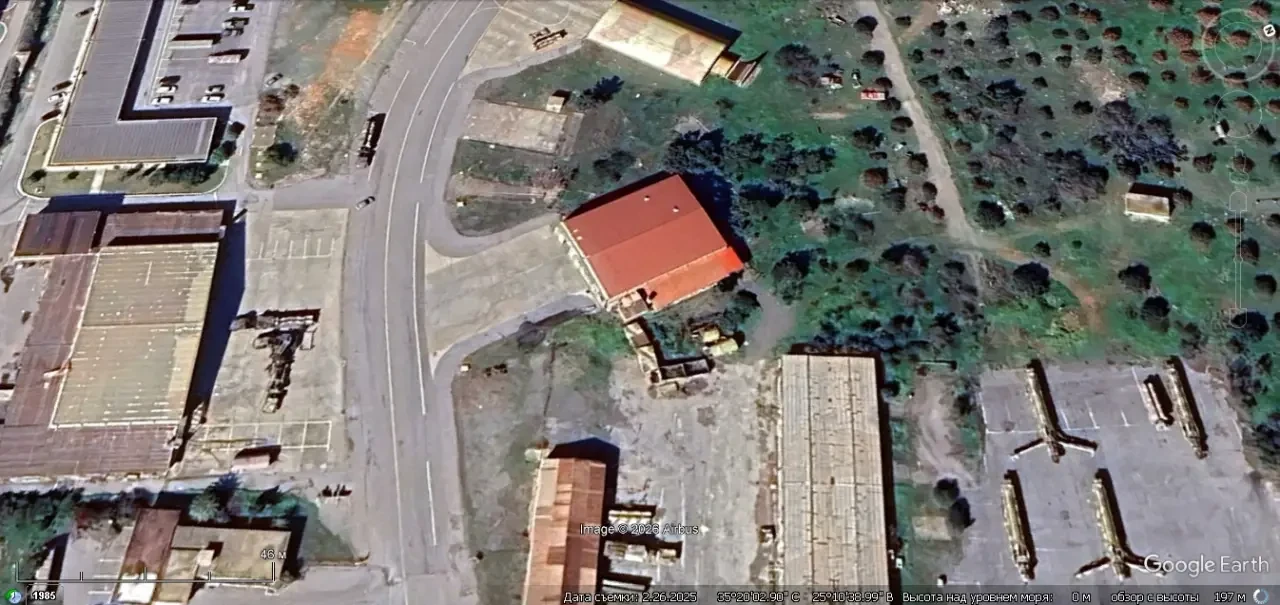 Спутниковый снимок Googlе Еarth: пустая огневая позиция ЗРС С-300ПМУ-1 в 3 км восточней аэродрома Казантзакис. Снимок сделан в феврале 2025 года