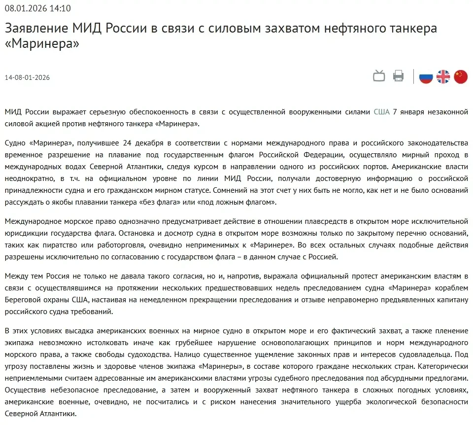 Вот только есть одна проблема – захват судна вооружённые силы (ВС) США (береговая охрана является одним из видов ВС США) осуществили 7 января 2026 года, а ещё 6 января 2026 года МИД России заявил: «Мы действительно с тревогой отслеживаем аномальную ситуацию, сложившуюся вокруг российского нефтяного танкера Marinera».