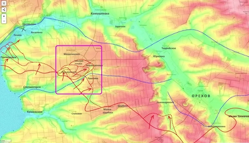 Среди отмечаемых эпизодов - прорыв за Приморское, выход к южным окраинам Речного и огневое воздействие на трассу Симферополь - Харьков, которая используется для снабжения украинских сил. Отдельно упоминается подрыв моста через реку Конка, который источники связывают с попыткой замедлить продвижение противника.