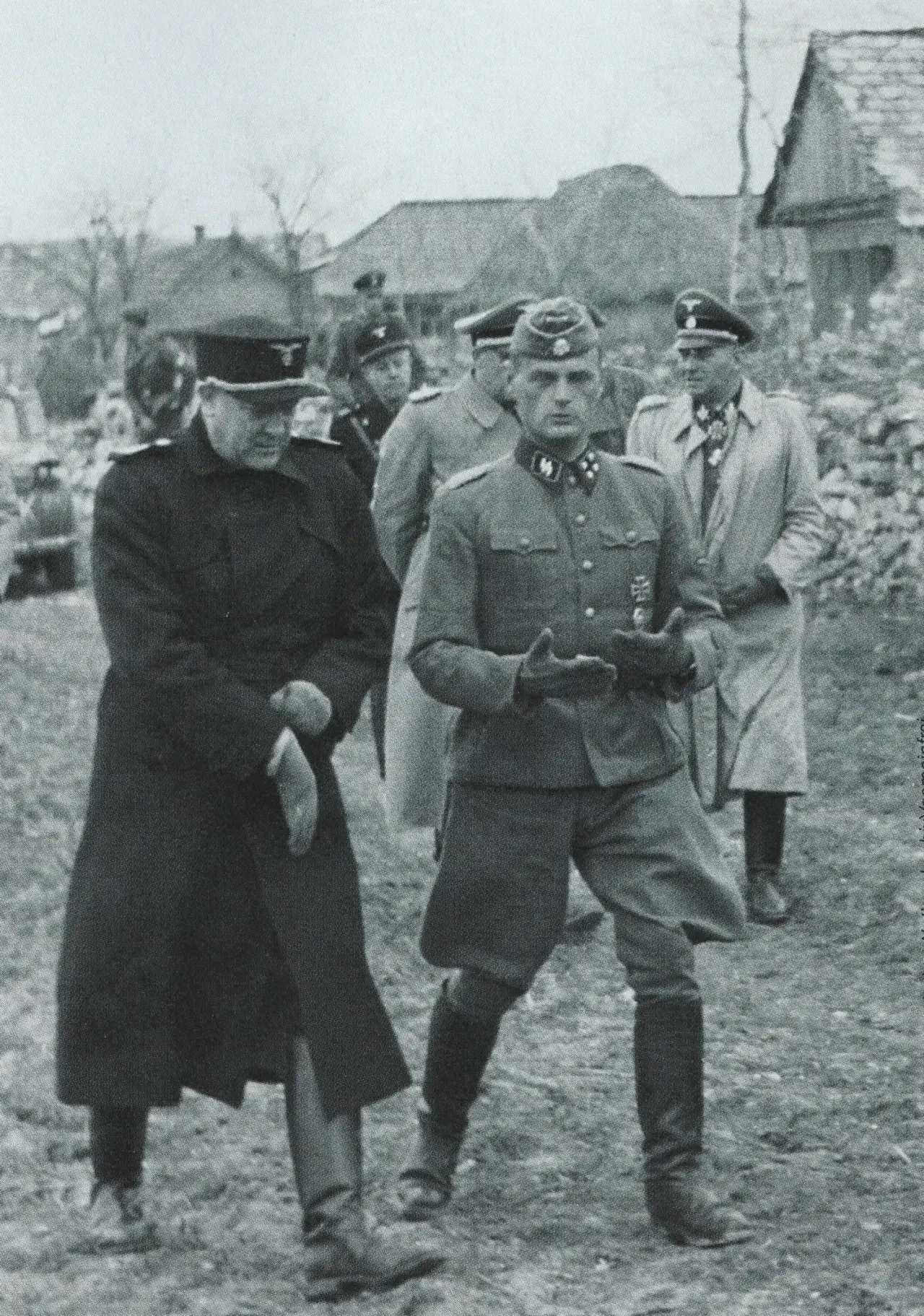 Премьер-министр Норвегии Видкун Квислинг (Vidkun Quisling) (слева) с командиром дивизии СС «Викинг» группенфюрером Феликсом Штайнером (крайний справа на заднем плане) во время поездки на Восточный фронт. На заднем плане министр юстиции Норвегии Сверре Риснэс (Sverre Riisnæs). Рядом со Штайнером (почти закрыт) — начальник СС и полиции в Норвегии обергруппенфюрер Вильгельм Редлисс. Калиново-Успенская. Май 1942